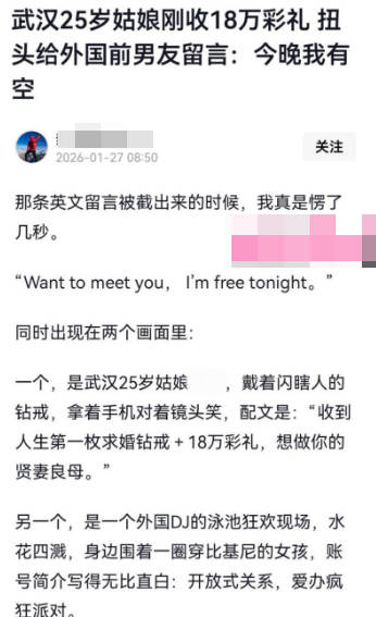 湖北武汉再曝媚黑大瓜!一名叫孟瑶的妹子,在网络平台上的一句圣诞快乐,引发了网友的热议,起因是这妹子与程序员未婚夫相恋7年,要了18万的彩礼,结果扭头就在网上晒自己贤妻良母的人设,不料被人扒出,还在一名英国DJ的评论区留言:今晚我有空。如此倒贴的行为,瞬间引发了网友们的轰动!
